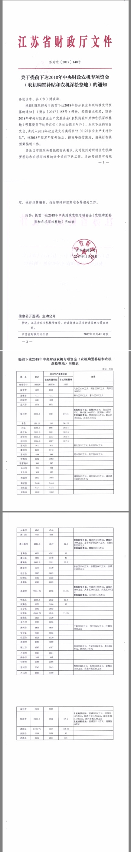 關于提前下達2018年中央財政農機專項資金(農機購置補貼和農機深松整地)的通知
