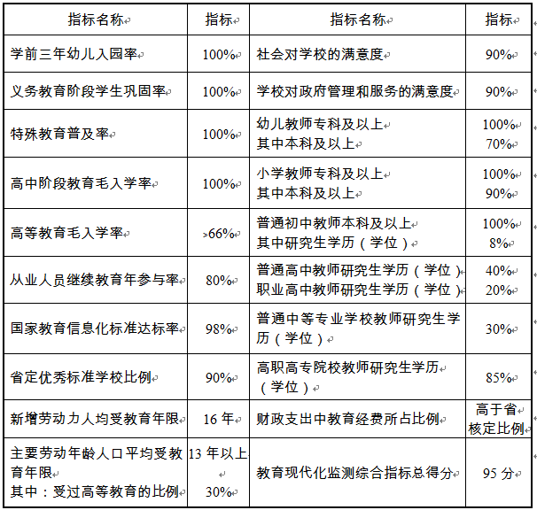 教育質量更具優勢。教育內涵發展水平顯著提高,教師隊伍素質明顯提升,素質教育全面推進,學校辦學更具特色,含“互聯網+”在內的優質教育資源總量不斷擴大,國家教育信息化標準達標率達到98%以上,省定優秀標準學校達90%以上,社會對學校的滿意度達90%以上,教育質量繼續保持在全省的優勢地位。