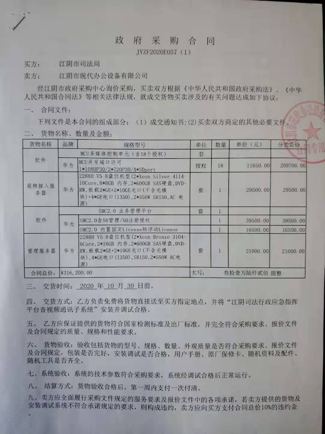 江陰市司法局應急指揮平臺音視頻通訊子系統項目詢價及成交結果公告及采購合同公開