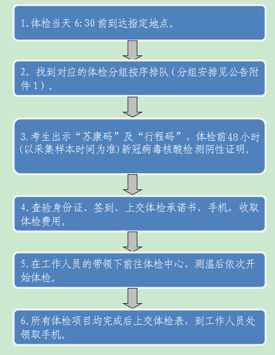 4、考生必須服從工作人員的安排,遵守體檢的有關紀律。如要暫時離開,必須征得工作人員的同意。如不服從安排,或自行離隊者,取消體檢資格;