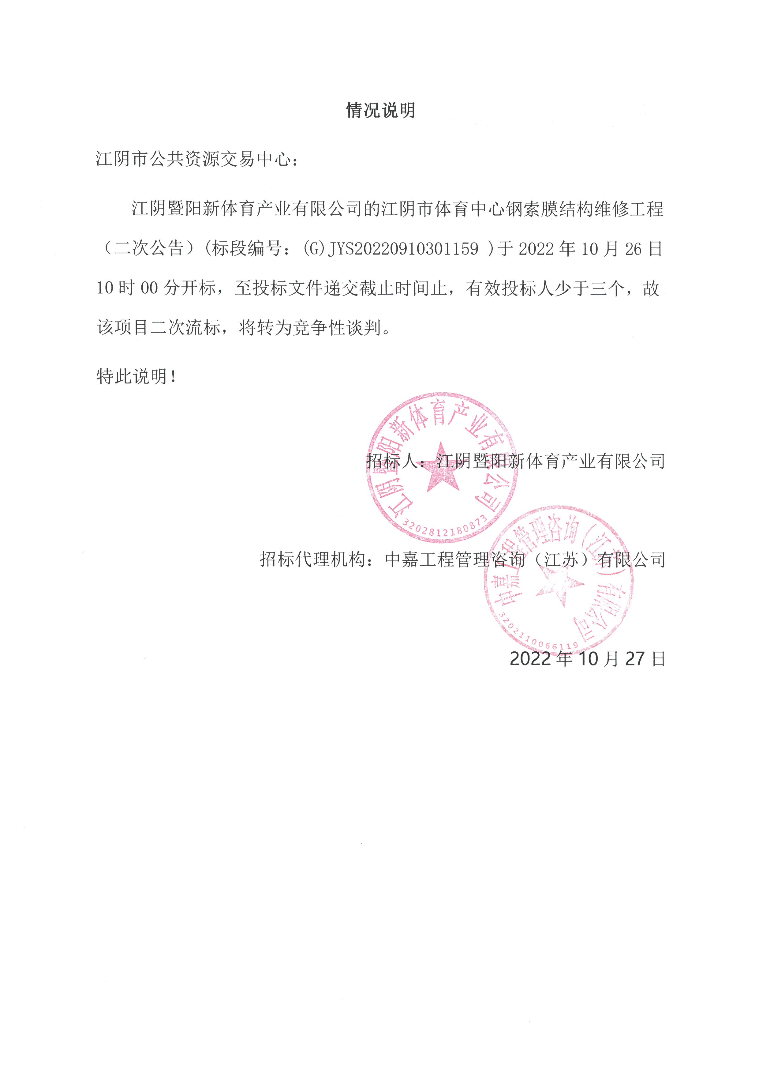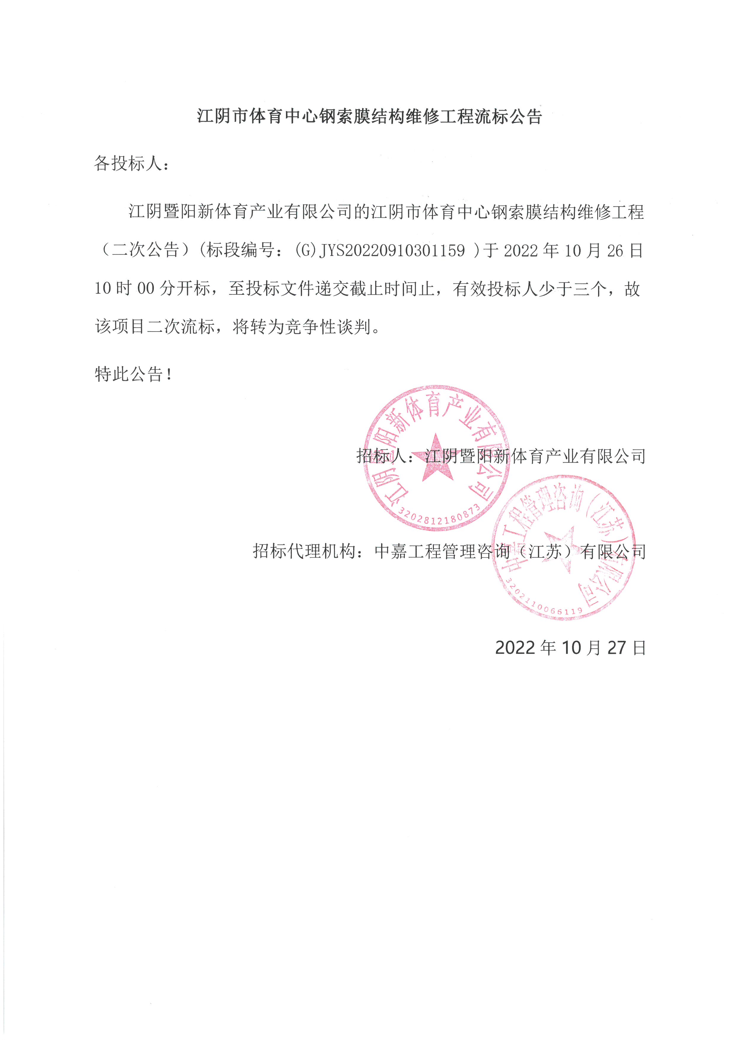 江陰暨陽新體育產業有限公司江陰市體育中心鋼索膜結構維修工程二次公告(標段編號:(G)JYS20220910301159 )于2022年10261000分開標,至投標文件遞交截止時間,有效投標人少于三個,故該項目二次流標,將轉為競爭性談判。