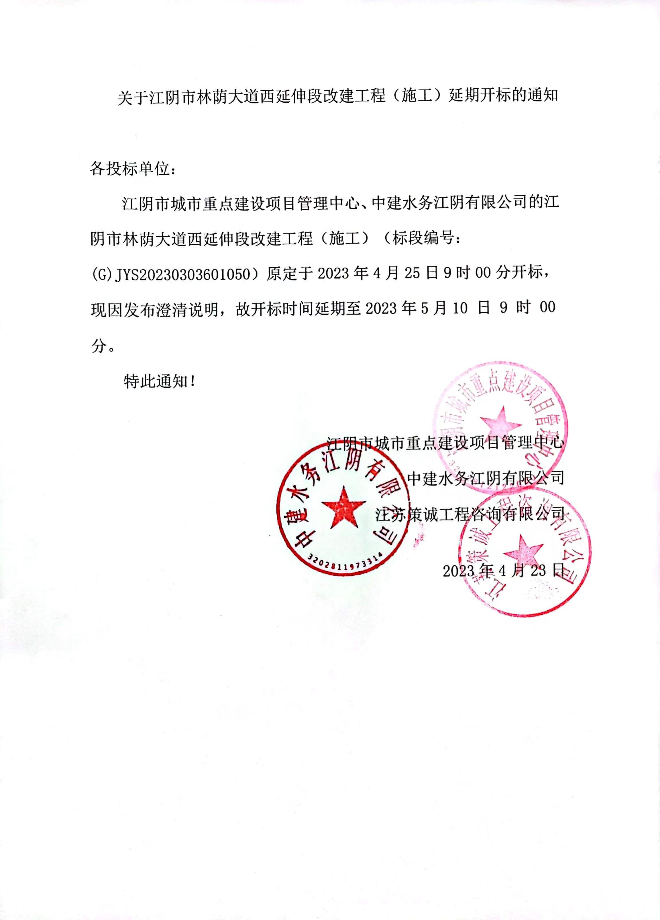 江陰市城市重點建設項目管理中心、中建水務江陰有限公司的江陰市林蔭大道西延伸段改建工程(施工)(標段編號:(G)JYS20230303601050)原定于2023年4月25日9時00分開標,現因發布澄清說明,故開標時間延期至2023年5月10 日 9 時 00分。