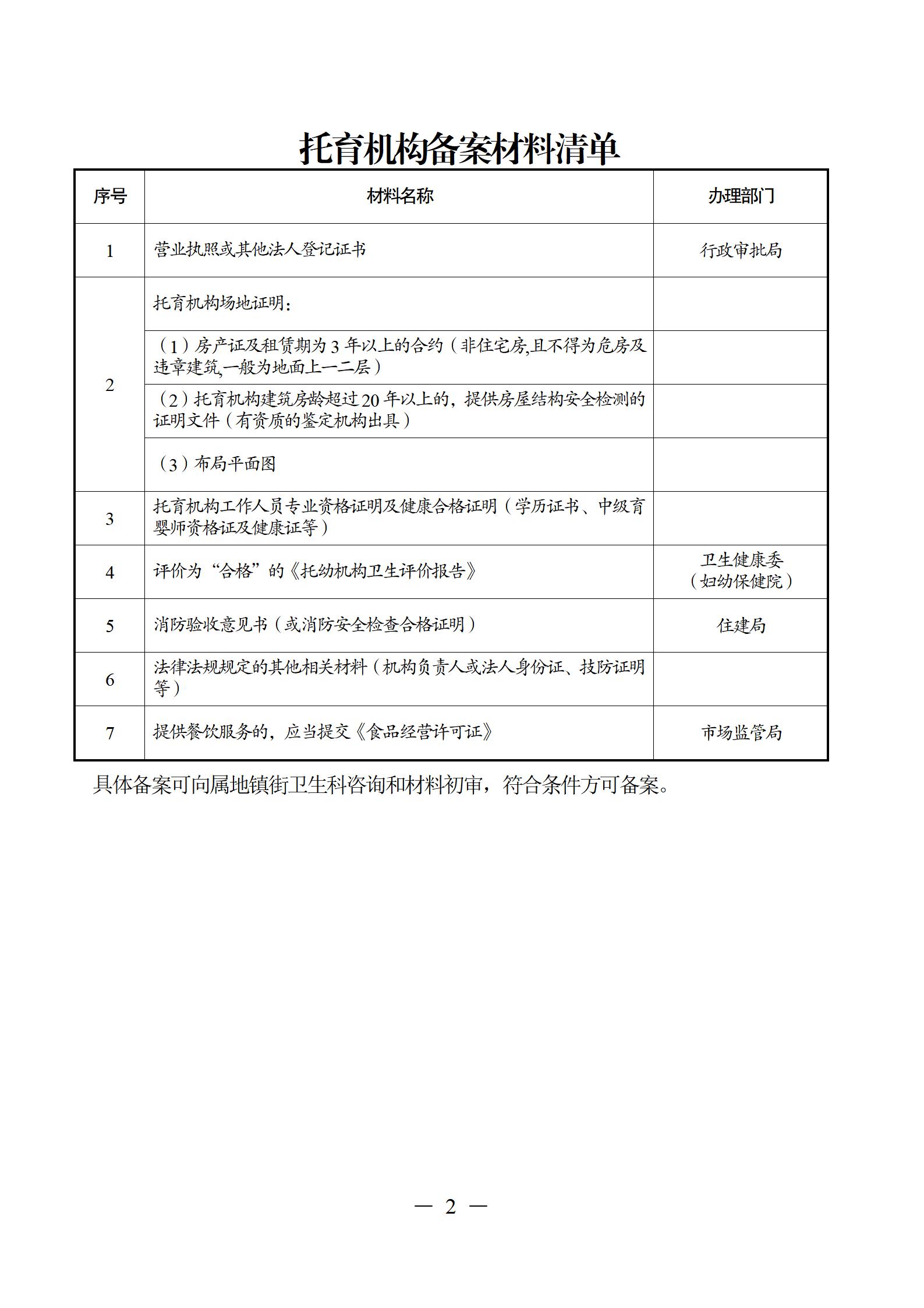 二、依據《人口與計劃生育法》規定,托育機構的設置和服務應當符合托育服務相關標準和規范,托育機構應當向縣級人民政府衛生健康主管部門備案。我市開展托育服務的機構必須向市衛生健康委備案?!锻杏龣C構備案材料清單》附后。