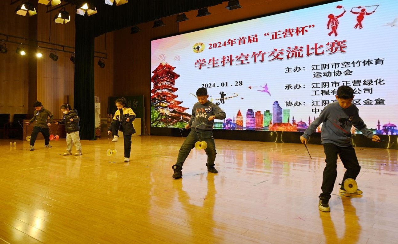 2024年1月28日,2024年首屆“正營杯”學生抖空竹交流比賽在江陰高新區金童中心小學隆重舉行。江陰市教育局基教科劉學東、江陰市體育事業發展中心主任李寧、江陰市金童中心小學副校長胡海榮、江陰市老年體協競訓科科長孔喜林出席活動。