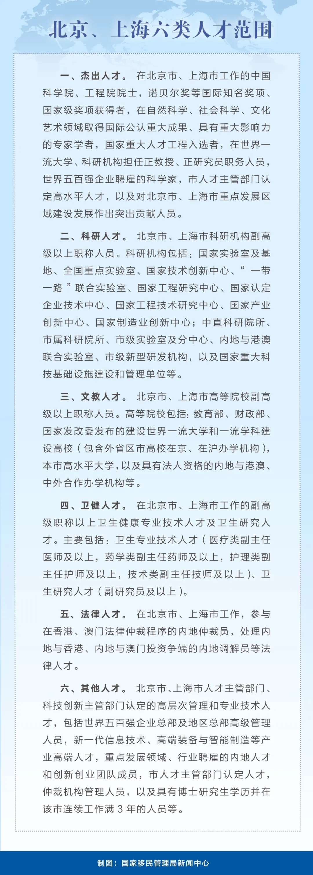 三、北京、上海六類人才可以申辦赴港澳人才簽注。將赴港澳人才簽注政策由粵港澳大灣區內地城市擴大至北京、上海。在北京、上海工作的杰出人才、科研人才、文教人才、衛健人才、法律人才以及管理人才等六類人才,可以憑有關人才證明,單獨或者同時申請辦理有效期1至5年不等的多次赴香港和赴澳門人才簽注,每次在香港或者澳門停留不超過30天。