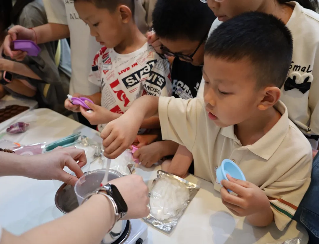 指紋印在紙上看不出來,怎樣才能讓它顯現出來呢?小朋友們在老師的帶領下,利用碘液進行神奇的指紋提取實驗。將天然植物油、精油、色素與各種天然添加劑巧妙地融合在一起,調配原料、攪拌、入模、脫模……每一塊手工皂都成為了獨一無二的藝術品。
