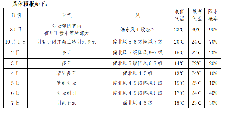 國慶假期天氣 據最新氣象資料分析,預計今年國慶假期我市天氣總體較好。假日前期(9月30日至10月1日)受較強冷空氣影響,我市將有一次明顯的降雨、降溫和大風天氣過程,其中30日夜里雨量中等局部大雨,1日起氣溫明顯下降,48小時降溫幅度8℃左右,并伴有6-7級偏北大風。2-5日以晴好天氣為主,氣溫變化平穩,但較前期明顯偏低,我市將進入氣象意義上的秋天;其中2-3日受第18號臺風“山陀兒”外圍環流影響,風力較大。6-7日云系增多,局地可能有弱降雨。