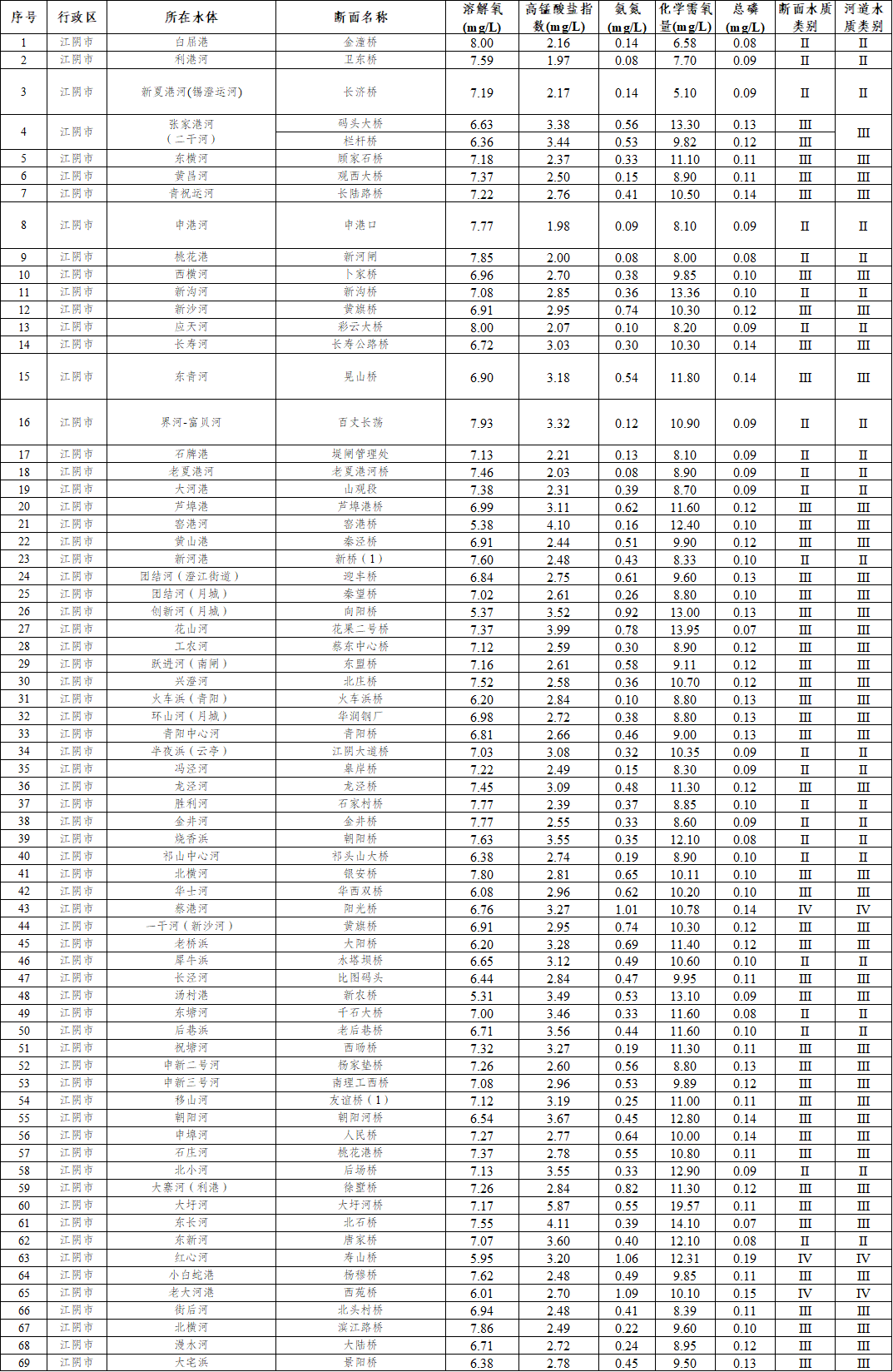 全市69條環境綜合整治河道水質明細表(2024年1-10月)