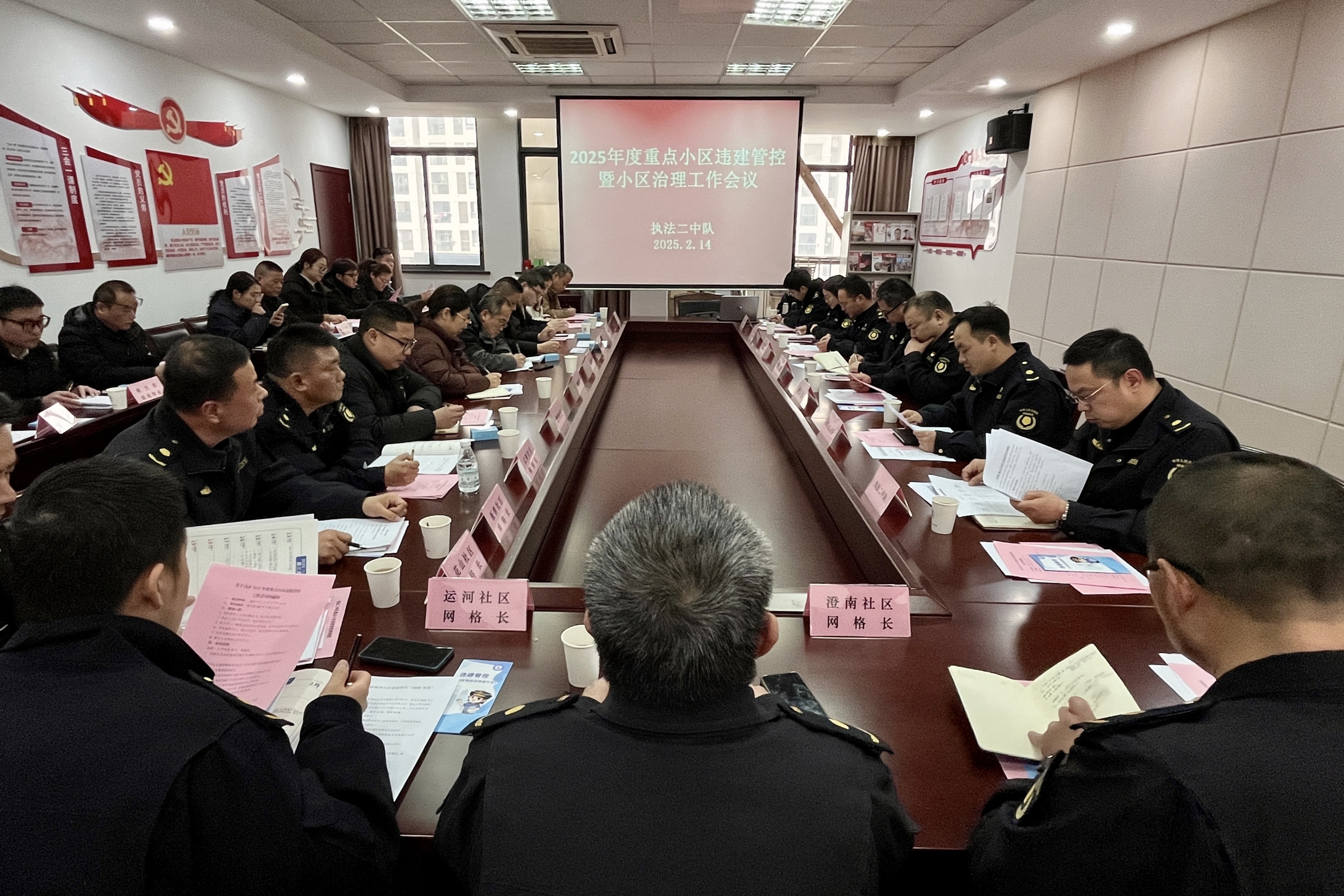 會議通報了2024年度轄區內重點小區違建管控以及12345投訴情況,下發了《執法二中隊2025年度違建治理實施方案》《重點小區違建管控制度》、二中隊違建管控網絡圖等材料,明確了執法中隊、社區和物業公司在違建管控方面的相關職責。