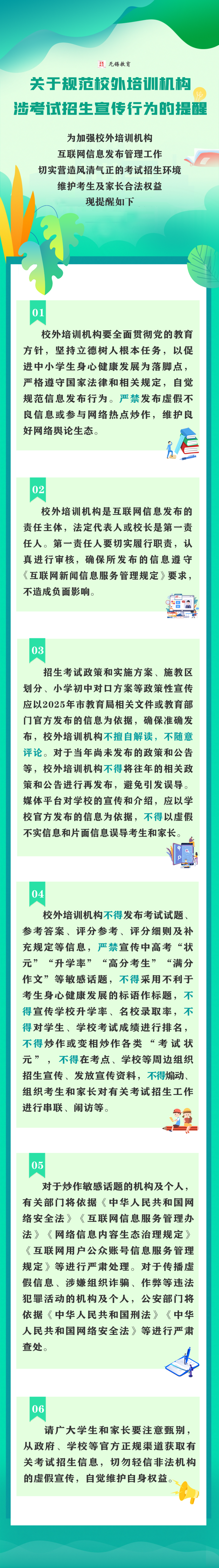 為加強校外培訓機構互聯網信息發布管理工作,切實營造風清氣正的考試招生環境,維護考生及家長合法權益,現提醒如下: