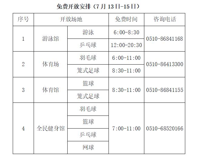 7月13日至15日江陰市體育中心對全市市民實行免費開放