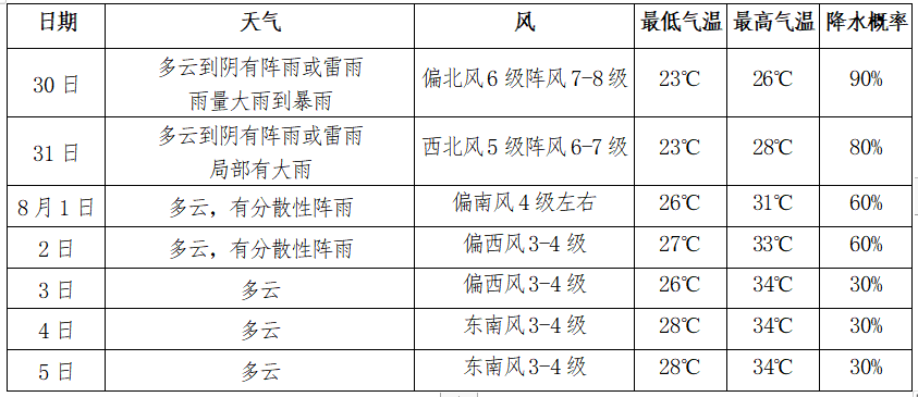 受“竹節草”影響,未來兩天我市有明顯風雨,主要影響時段為29日后半夜至31日上午。臺風期間陣風可達7~8級、沿江江面9~10級;過程累計雨量80~100毫米,局部120~150毫米,并伴有小時雨強20~30毫米的短時強降水。預計31日后期風雨影響逐步減弱,8月1-2日有分散性陣雨,3日起以云系變化為主。受臺風影響,未來幾天氣溫明顯下降,30日最高氣溫26℃,31日最高氣溫28℃,隨后幾天氣溫逐步上升,3日起最高氣溫上升至34℃左右。