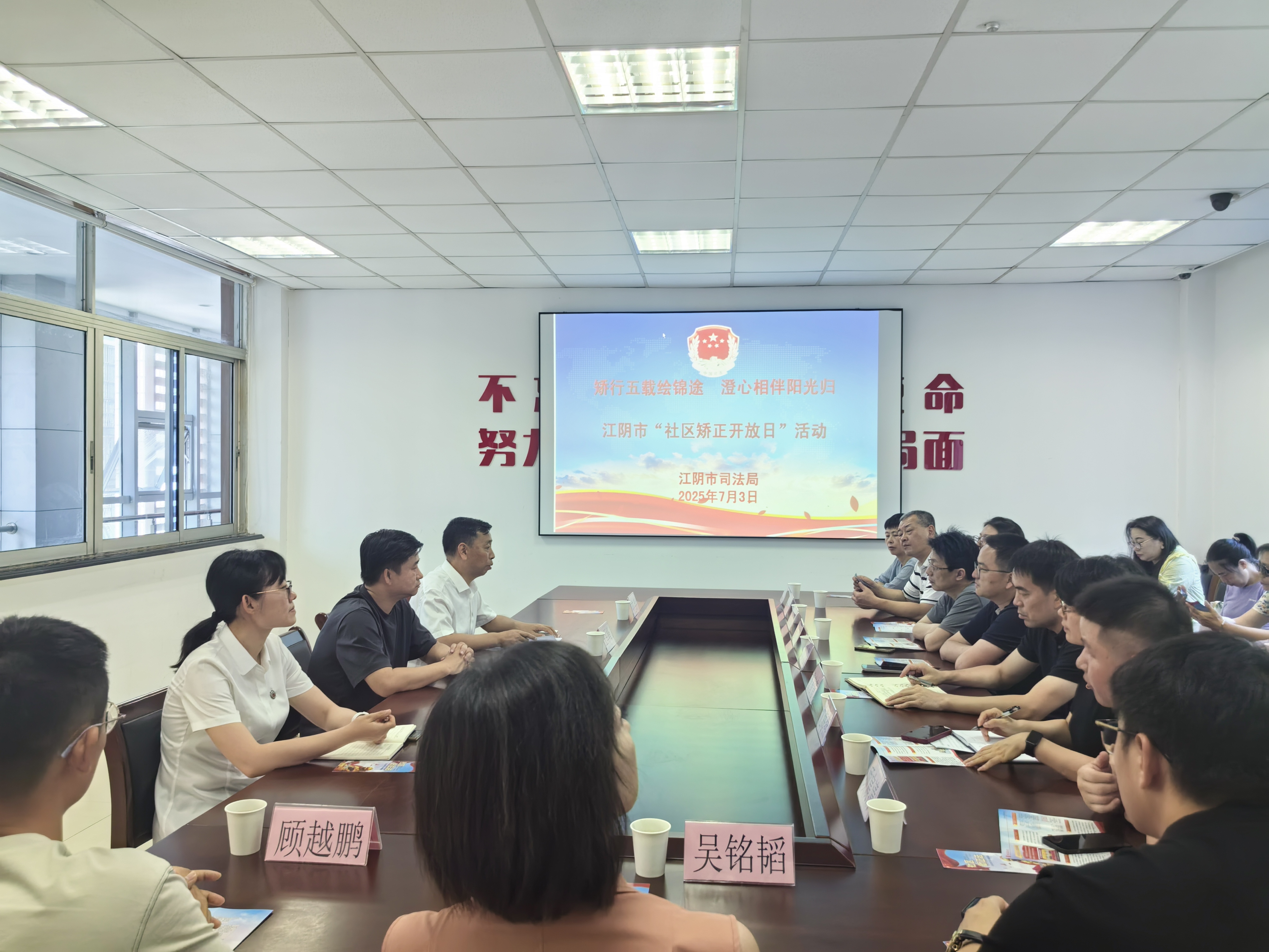 二是光影凝萃:多維度繪就矯正工作“成效卷”。步入二樓會議室,一場精心籌備的“光影之旅”拉開帷幕。社區矯正宣傳視頻以“四系列十二項系統性工程”為脈絡,從制度創新、智慧監管、精準幫扶、社會協同等維度,全景式展現江陰社區矯正工作體系化推進成果。視頻中,標準化入矯流程、智慧監測平臺、“一對一”心理干預等創新實踐輪番呈現,生動詮釋十二項工程如何凝聚成推動矯正對象重塑新生的強大合力,彰顯江陰社區矯正工作科學化、精細化的創新探索。