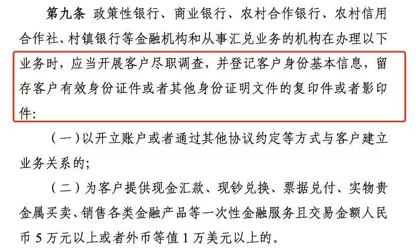 此外,在為客戶提供現金匯款、實物貴金屬買賣等一次性交易金額業務超過5萬元的,金融機構仍需開展盡職調查,并登記客戶身份基本信息,留存客戶有效身份證件或者其他身份證明文件的復印件或者影印件。