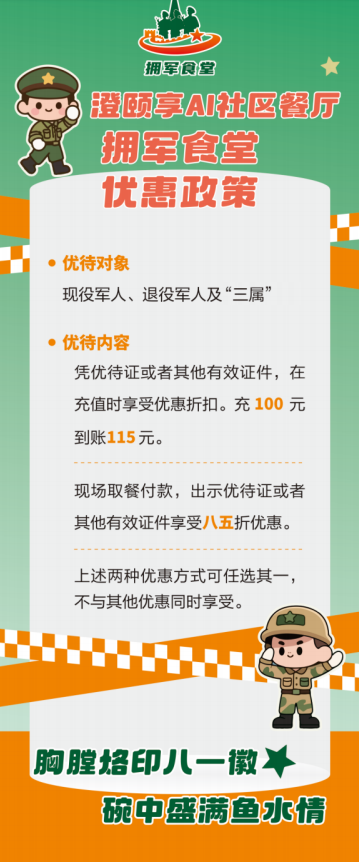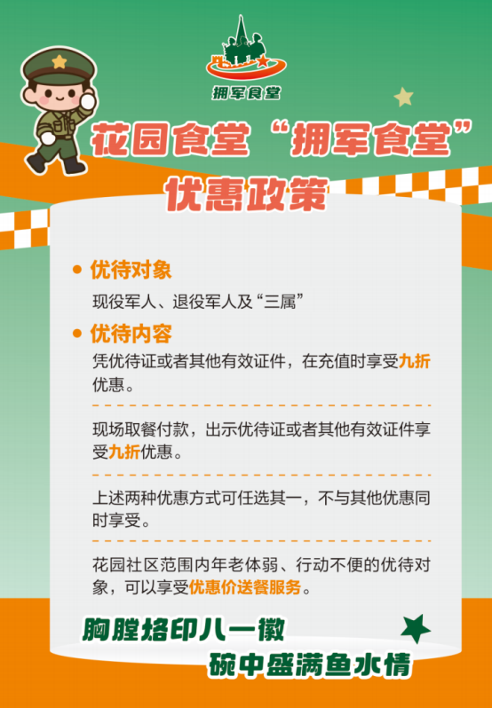 “擁軍食堂”面向現役軍人、退役軍人和“三屬”開放,憑相關證件可享受餐飲折扣優惠。