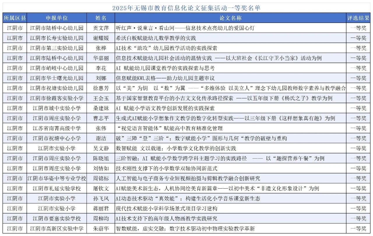 近日,2025年無錫市教育信息化論文征集活動獲獎名單公布。江陰市以總數100篇獲獎的優異成績脫穎而出,獲獎篇數位居無錫全市前列,其中一等獎21篇、二等獎29篇、三等獎50篇,多篇論文被選送參加省級論文征集活動。江陰市教育信息化和裝備管理服務中心榮獲優秀組織獎,充分彰顯了江陰教師在教育信息化研究與實踐領域的深厚底蘊與創新活力。