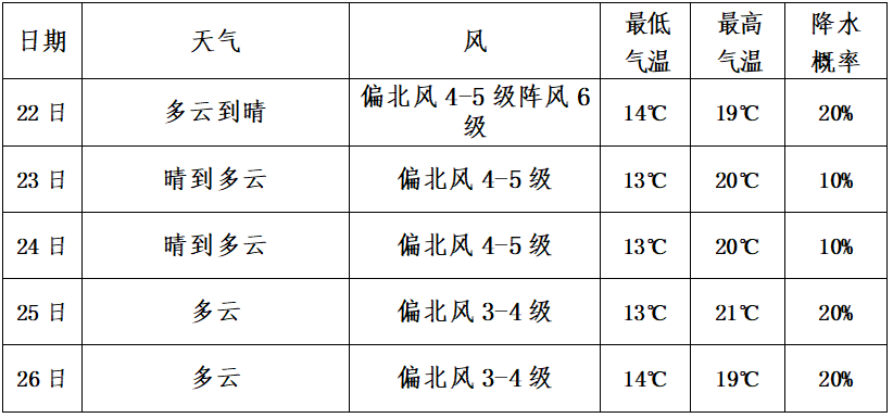據最新氣象資料顯示,22-25日以晴好天氣為主,早晨氣溫偏低,白天氣溫逐步小幅上升;預計26日后期還有一股弱冷空氣南下,最低氣溫將進一步下降。請注意防范。